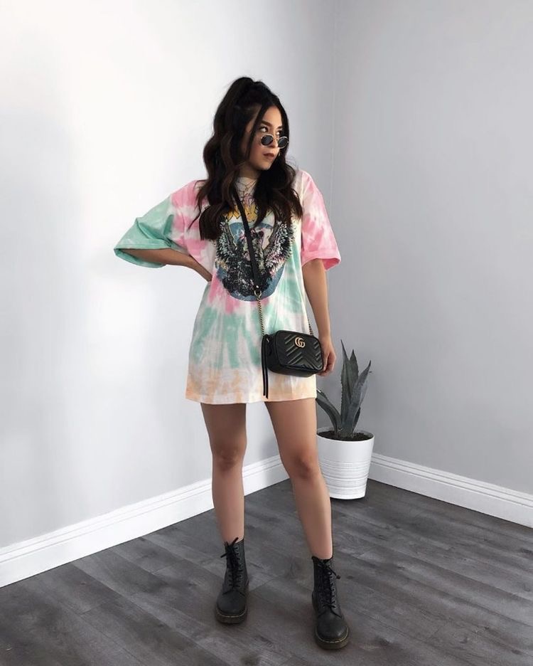 你也可以尝试薄荷绿+少女粉的搭配,再加上复古印花的点缀,这样的T恤裙让造型看上去个性又洒脱,再配上马丁靴,是不是特别有街头感呢?