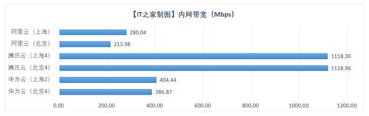 测试结果来看,华为云内网带宽在400Mbps上下,腾讯云内网带宽在1100Mbps上下,阿里云内网带宽在280Mbps上下。整体来看,腾讯云内网带宽根据优势,适合数据量比较大的多台服务器组成的内网。